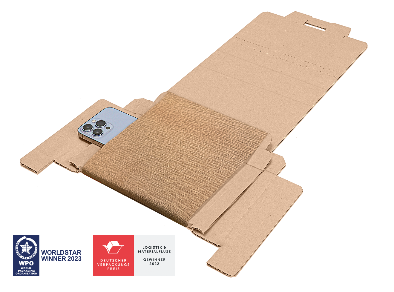 Klimaneutral produziert aus 100 % nachwachsenden Rohstoffen, kann das Packgut über eine innovative Spanntechnik mit Natronkrepppapier fixiert werden und garantiert maximalen Produktschutz ganz ohne Folie sowie ohne zusätzliches Füllmaterial. Die umweltfreundliche Verschlusskonstruktion sorgt für maximale Sicherheit ohne die Verwendung von Klebstoffen.